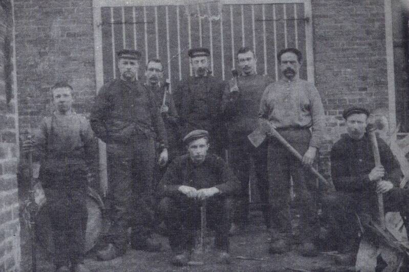 - Roelie Spanjaard-Visser: Volgens het bijschrift staan van links naar rechts een onbekende, Taeke Bijlsma, Kooi (?), Jan Siebold de Vries (in het midden met pijp), een onbekende, Frens de Vries met grote bijl en, geheel rechts zittend, een onbekende. De jonge man zittend in het midden zou Van Brug of Haagsma kunnen zijn. Als de naam Taeke Bijlsma klopt, moet de foto van voor 25 februari 1913 zijn want op die dag overlijdt hij.