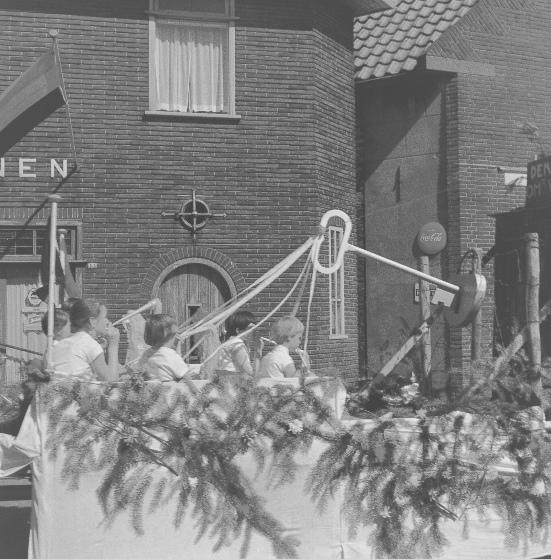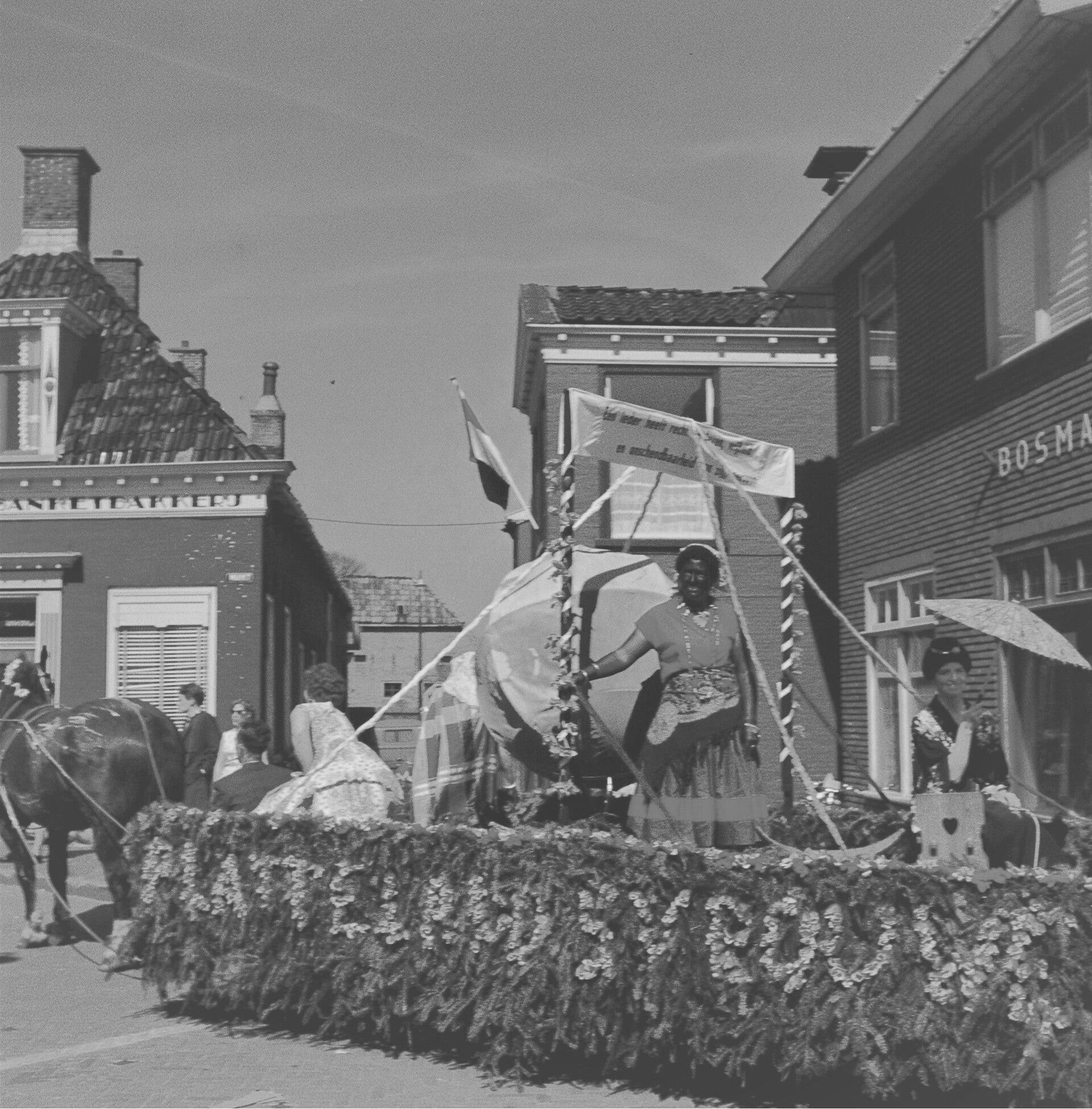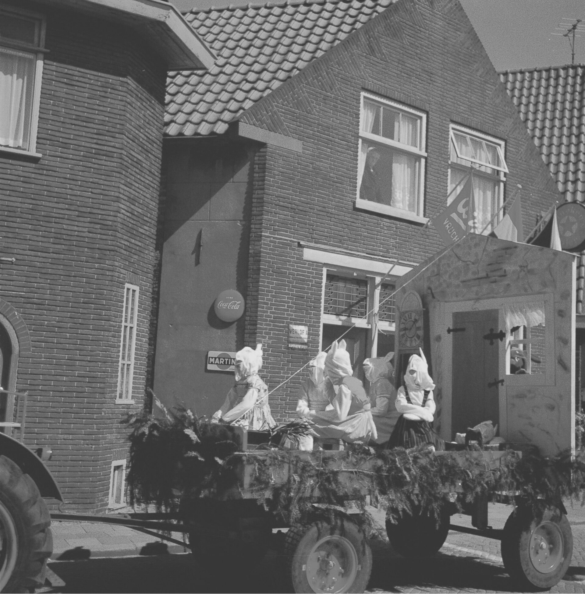 Deze foto was voor mij (Roelie) een grote verassing, want als 5 á 6 jarig kind, zat ik in de kar..iets met zo'n geel mutsje op... en mijn zusje Gea, was het Prinsesje op de kar, met kroontje op. Mijn moeder is te zien naast te kar...Misschien dat iemand de andere heren herkend?.
