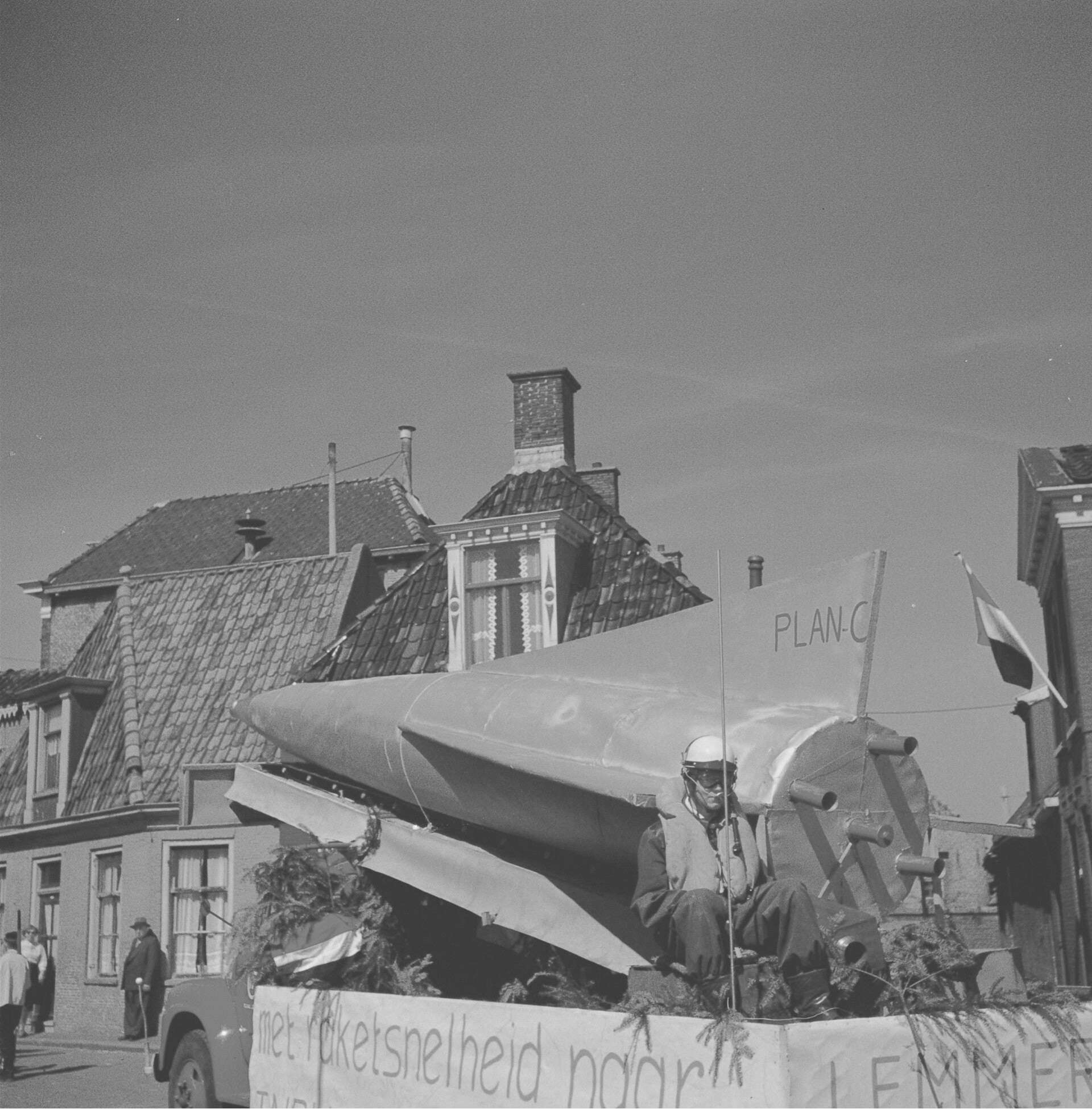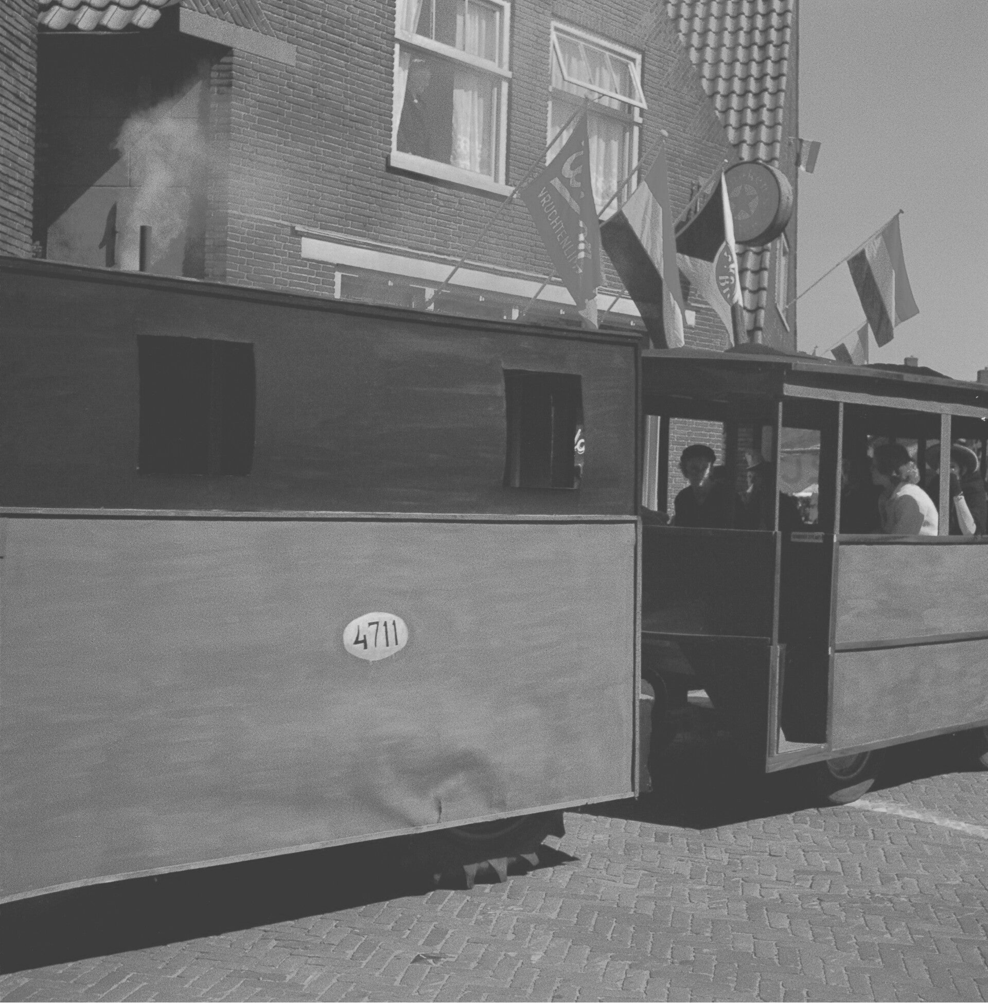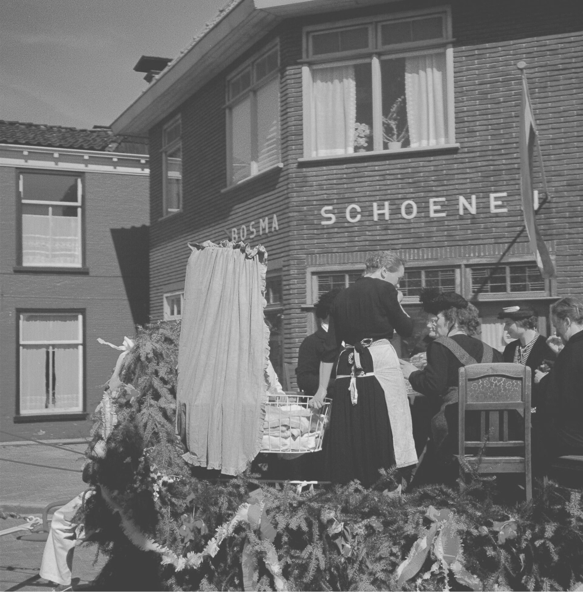 Deze foto was voor mij (Roelie) een grote verassing, want als 5 á 6 jarig kind, zat ik in de kar..iets met zo'n geel mutsje op... en mijn zusje Gea, was het Prinsesje op de kar, met kroontje op. Mijn moeder is te zien naast te kar...Misschien dat iemand de andere heren herkend?.