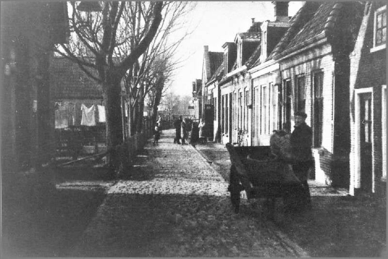 Rechts bij het kerkje voor de steeg staat Pietje Schotsman, met als altijd haar hagelwitte floddermuts, zwart jakje en zwartbonte schort