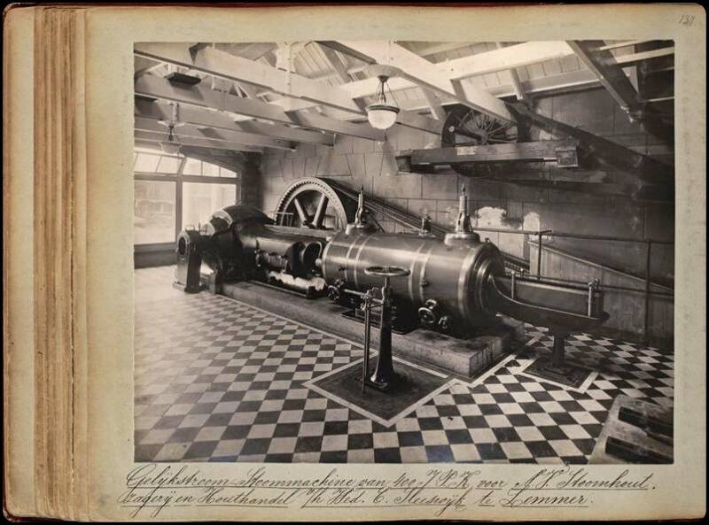 Op de foto is mooi te zien dat de riem-aandrijving onder de grond verdwijnt. Het drijfwerk van de fabriek zat voor een belangrijk deel onder de grond, maar op de foto zien we ook een wiel van het drijfwerk dat hoger in de fabriek was aangebracht.
