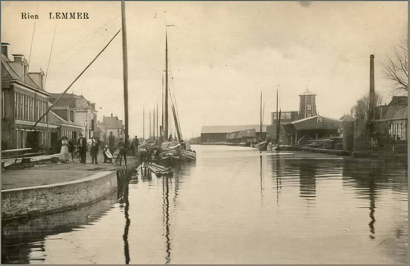 Op de linkeroever van de Lemster Rien, waren de bedrijven van mastmakerij Van de Neut en de zeilmakerij van de Vries gevestigd. Op de rechteroever bedrijfswoningen van de daarachter gelegen Houtmolen.
