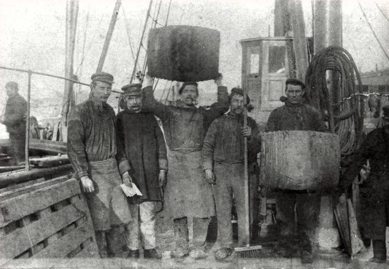Laders en lossers van de tramboten, onder leiding van D. Dijkstra, 2e van rechts.