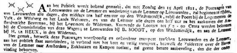 In aansluiting op de "Amsterdammer Beurtman" zoals de boot uit Amsterdam in die tijd werd genoemd, reden er sinds 1 april 1833 van uit De Lemmer, door de logementhouder (van het Heeren Logement in Leeuwarden) Carel Hermanus Wilkeshuis geëxploiteerde, diligences en postwagens naar Leeuwarden, over Joure, Akkrum en Eernsum. Het tarief voor één persoon op de diligence of postwagen bedroeg drie gulden, "alle tollen en schouwgelden hieronder begrepen"; en in de kajuit op de beurtman 1 gulden 20, zodat voor 4 gulden 20 de reis van Amsterdam naar Leeuwarden kon worden gemaakt. De reis in De Lemmer begon bij De Wildeman, in Leeuwarden bij "Het Heeren Logement" in het Zaailand.