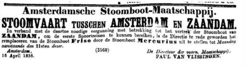 In 1853 werd ook de "gerenommeerde" stoomboot "Friso" gebruikt op de lijn De Lemmer-Amsterdam. in aansluiting op de binnenstoomboot "Tjerk Hiddes" en de barge (trekschuit) naar Groningen, alsmede op de diligencedienst op Heerenveen.