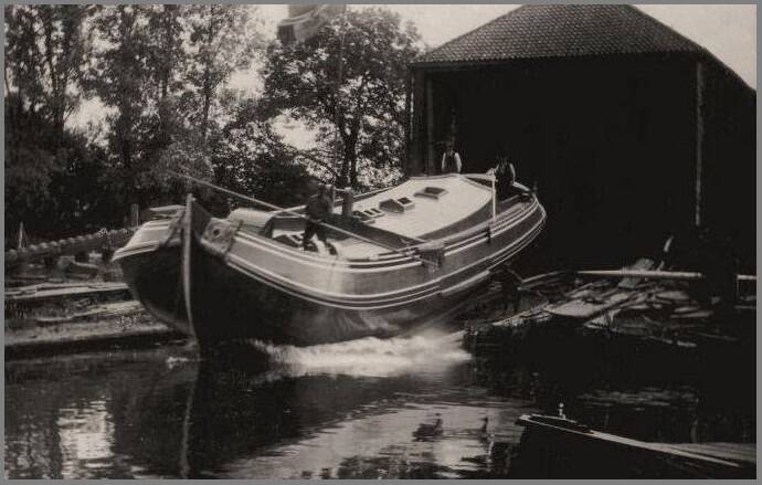 Behalve de grootere schepen en de eenvoudige pramen en bokvaartuigen werden aan de werf boeiers en jachten gebouwd, zóó prachtig van lijn, als zeker haast nergens elders. En snelzeilers waren dat tevens, want ook hierop was „het oog des meesters" gericht. De lijnen moesten zóó loopen, dat vóór weinig water verduwd en achter het water gemakkelijk losgelaten werd.