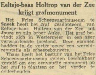 Te Joure is Maandagmorgen, 85 jaar oud, overleden de bekende bouwer van boeiers, de heer Auke Holtrop van der Zee. Een hartverlamming heeft plotseling een eind aan zijn leven gemaakt.