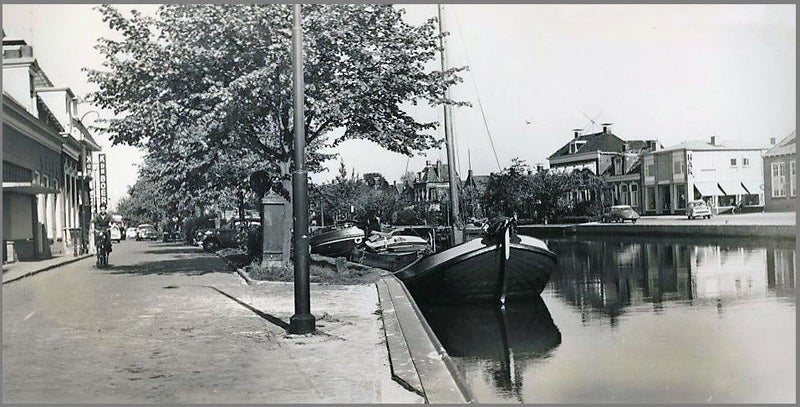 Een deel van een turfschip, beladen met een zware deklast, bevindt zich hier in de hoek van Het Dok, voor de locatie waar destijds de Tweelinghuisjes zijn afgebroken. Een vergrote weergave van deze foto werd destijds meegenomen naar het Gemeentehuis om te illustreren hoe prachtig deze woningen hersteld zouden kunnen worden. Ten tijde van de discussie over het behoud of de sloop van deze gebouwen, was er door opeenvolgende eigenaren of huurders aanzienlijk aan de huisjes gewijzigd. Helaas waren deze aanpassingen doorgaans niet in het voordeel van de oorspronkelijke staat.