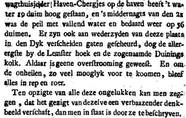 In het Chergers Huisje op de Haven heeft het water 17 duimen hoog gestaan, de Zeedijk bewesten deze Haven heeft op verscheidene plaatzen in groot gevaar geweest om door te breken, waardoor hier alles in de grootste Consternatie was; egter zijn wij door de goede Orders en door de vigelantie der Ingezetenen met het spoedig aanbrengen van Zeilen, Steenen. Stroo, Planken, Masten en andere Materialen om de reeds wegscheurende Dijken te stoppen, door Gods hulpe voor Innundatie bevrijd en in het zogenaamde Omland beoosten deze Haven alwaar drie Boersplaatzen staan, heeft 't Water 10 a 11 voeten hoog geweest, waardoor deze Menschen hun Vee meest in het Water zijn versmoord; en hebben zelfs hun Leven op 't Hooy moeten salveeren. De eilanden Wieringen Marken, Urk en Schokland werden geheel overspoeld.