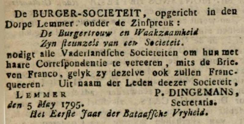 De burgersociëteit „De burgertrouw en waakzaamheid zijn steunsel van een Sociëteit" te Lemmer vraagt correspondentie.