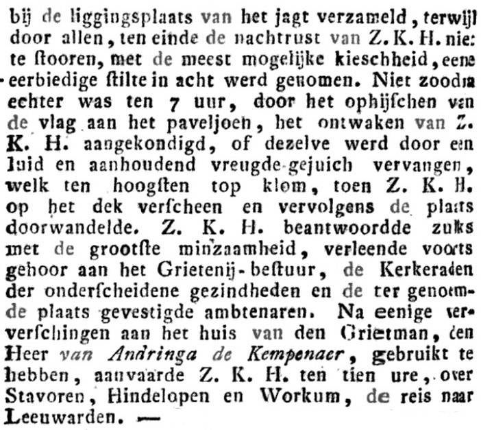 De prins van Oranje (Willem Frederik George Lodewijk (Den Haag, 6 december 1792 – Tilburg, 17 maart 1849), Prins van Oranje-Nassau.) komt 's morgens 4 uur met een jacht van Amsterdam te Lemmer, geeft daar audiëntie aan allerlei corporatie's, komt ten huize van den grietman van Andringa de Kempenaer en zet zijn reis te 10 ure voort over Staveren naar Hindeloopen. Daar wordt hij verwelkomd door de burgemeesters D. j. Duif en J. Alderts en door zes juffers in de oude kleederdracht.