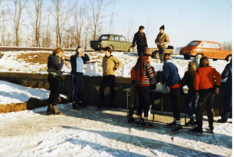 We spelen met Nappie ’81 ook weer en blijven winnen. Toch mooi dat je ondanks de vorst nog even een balletje kan trappen. Zo blijf je in conditie en dat is wel nodig als er door de beide scholengemeenschappen in Lemmer een toertocht op de schaats wordt georganiseerd. Er wordt gestart bij de brug in de Langesloot in de Brekkenpolder en men kan kiezen uit een 10 of 25 kilometer tocht. De lange tocht gaat naar Woudsend. Als nou niet direct een begenadigd schaatser ga ik toch maar mee in het spoor van Gerrit de Vries en Jan Arie Schuil richting Woudsend. Kreunend en totaal gebroken kom ik tenslotte terug op het startpunt, dus toch maar gehaald!