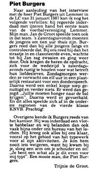 Er kwam een interview met onze v.v. Lemmer voorzitter, Piet Burgers, in de Leeuwarder Courant. Veel over zijn verleden en hoe in Lemmer terecht te zijn gekomen. (Houthandel de Groot) Natuurlijk over zijn eerste periode als leider van het eerste elftal van de v.v. Lemmer, waar hij mij aan het einde van die periode, toen ook bij het eerste elftal haalde, net uit de A-junioren vandaan. Op die periode kwam een reactie van Trijnie de Groot, de vrouw van 1 van de toenmalige eerste elftalspelers. Weet nog dat mijn broer Jelle Visser toen keeper van het eerste was en dan thuis wachtte tot Burgers langs was geweest en hij toen samen met meerdere eerste elftalspelers, alsnog naar Sneek vertrok om naar de bars in Sneek te gaan, op jacht naar vrouwelijk schoon.