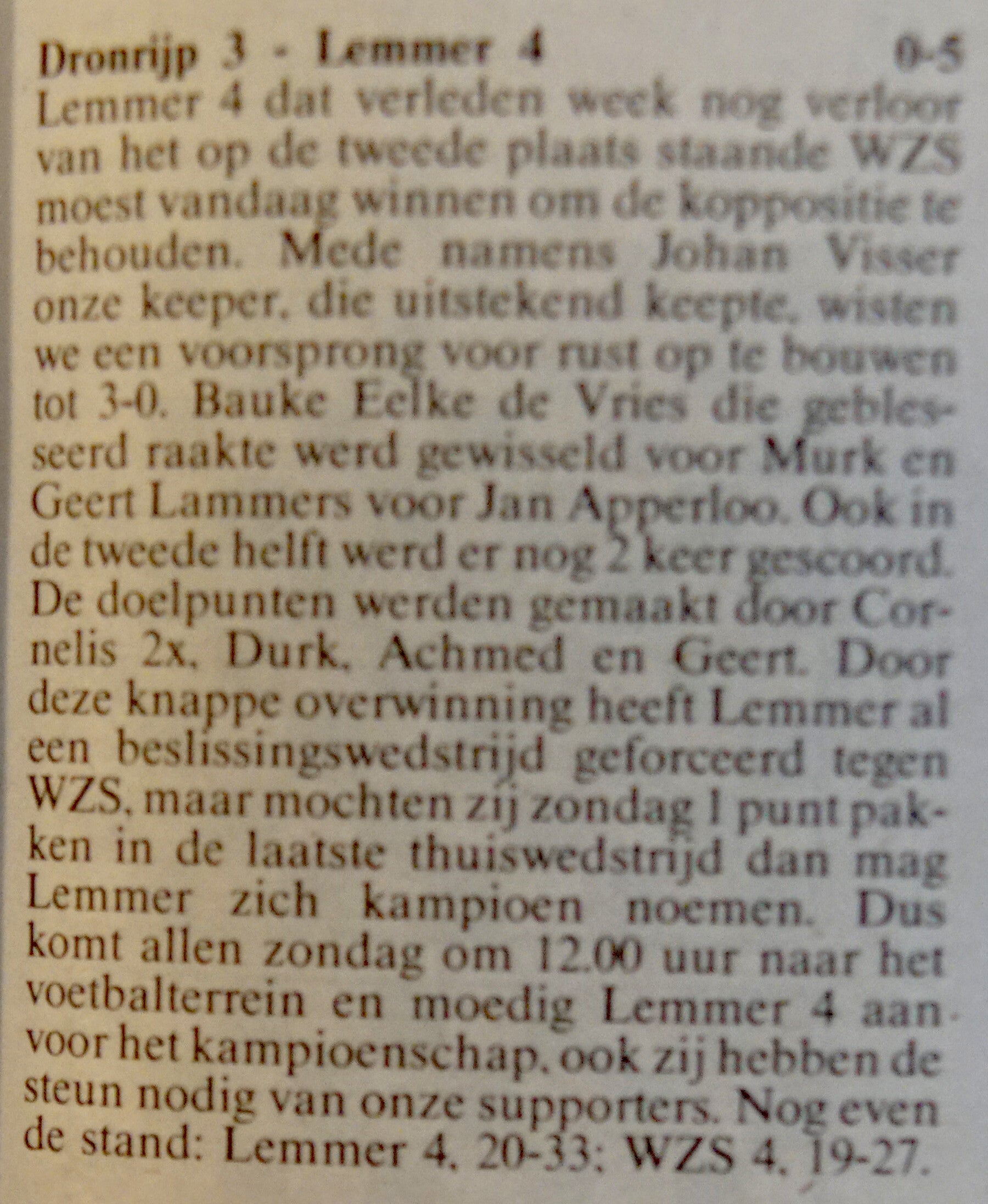 De voetbalcompetities lopen naar een eind en de spanning stijgt, niet voor lemmer 1. Zij winnen thuis achtereen volgens van Franeker met 3-0 en met 4-0 van ONB uit Drachten en zijn reeds ruim voor het einde kampioen van de 3e klasse A van de KNVB. Trainer Thomas de Haan, verwacht met dit team volgend seizoen in de 2e klasse in de middenmoot mee te kunnen draaien. Wij met Lemmer 4 winnen met 3-0 van LSC 5 uit Sneek en krijgen de volgende week onze achtervolger WZS uit Sneek op bezoek. We staan nu nog 5 punten voor en kunnen met een gelijkspel reeds een feestje gaan vieren.