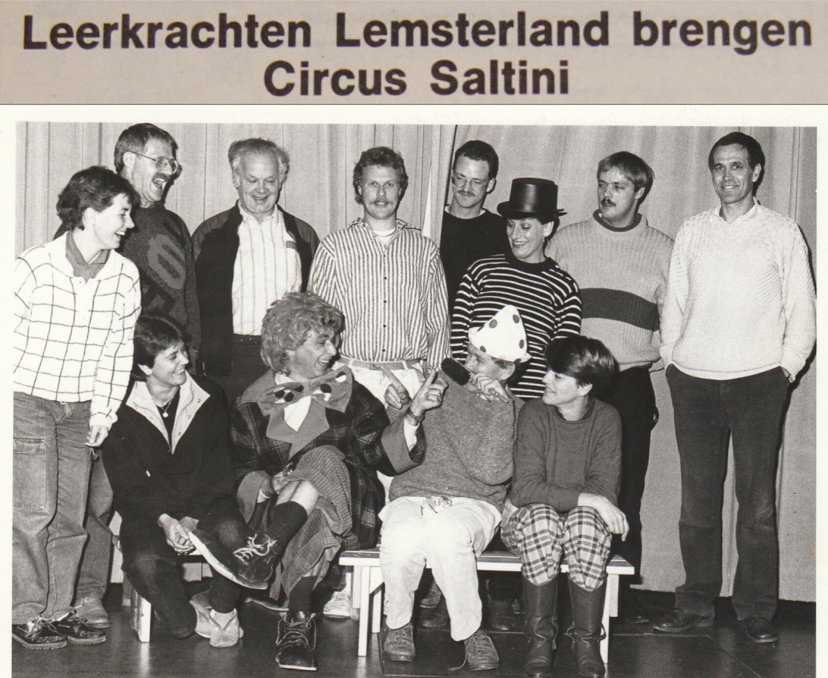 Dan is het eindelijk zover, we kunnen het toneel op. Net als elk jaar bestaat het publiek overdag uit de schooljeugd van de gemeente Lemsterland en in de avond voor belangstellenden. Waarvan er toch maar weer zo’n 150 komen opdraven, waaronder ook weer mijn heit en mem. Het verhaal speelt zich dit jaar af in het “Circus Saltini” en is ook nu weer geschreven door Jan Gelling, Popke Popma en Fer Kottier. Voor het eerst spelen er ditmaal ook enkele leerlingen mee als circusact “de Flying Rienitos” bestaande uit: Edward de Boer, Arjenne Dijkstra, Agnes Schokker, Patricia Spaan en mijn oomzegster Thea Visser.