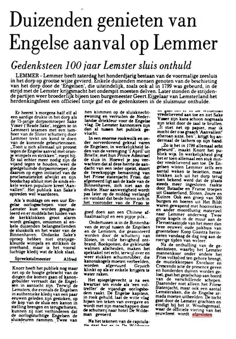 Terwijl mijn vakantie er weer op zit en mijn werk op de school dus zijn aanvang weer neemt, is een stuurgroep bestaande uit diverse geledingen van de gemeente, onder leiding van een bestuur, bestaande uit Piet Burgers, Annemarie van der Berg, Ellen Stillebroer en Simon Tuinstra, bezig met de invulling van de activiteiten ten behoeve van het eeuwfeest van de Lemster sluis, wat groot gevierd moet worden natuurlijk. Het Lemster Mannenkoor dat dit jaar twintig jaar bestaat, heeft het streven om van 80 naar 100 zangers uit te breiden.