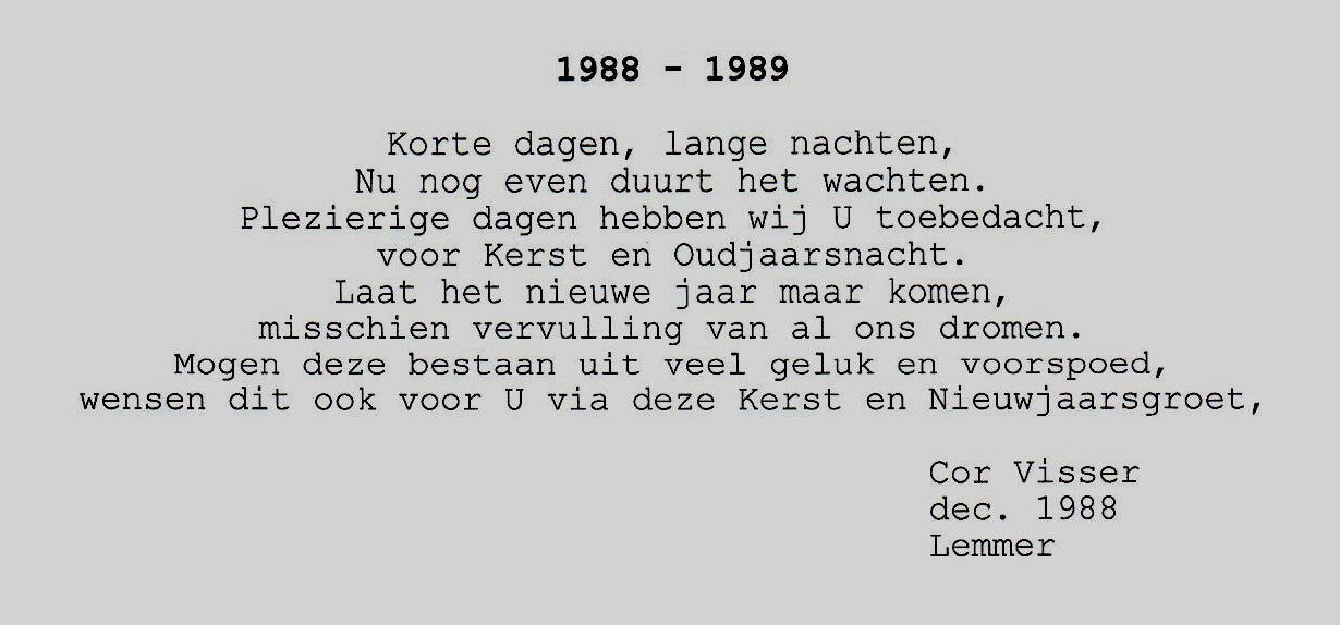 Het is oktober, als het bestuur van “De Rien” adviseert om Cor Visser, ik dus, tot waarnemend hoofd van de administratie te benoemen, doch de besluitvorming in overleg met de nieuw te benoemen directeur te doen. Zo was langzaam mijn naam van Cornelis Visser veranderd in Cor Visser, ook in de communicatie naar mij toe. Deze benoeming vindt zijn oorsprong in het in de winter maanden afwezig zijn van het huidige hoofd van de administratie Jos Boonstra.