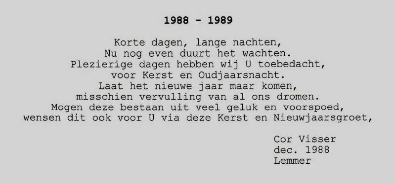 Na een redelijk rustig verlopen oudjaars avond, zijn er de jaarlijks terug kerende rituelen van het nieuwjaarswensen bij mijn ouders op nieuwjaarsdag. We blijven niet te lang, omdat we ook rekening moeten houden met de dierentuin thuis. Ach het houd je van de straat nietwaar. De gemeente heeft andere (geld)zorgen. Het Lemster strand is er slecht aan toe. Door invloeden van het weer, is er nauwelijks nog een strand over. Er is minstens 15.000 kubieke meter zand nodig om het strand weer in redelijke conditie te krijgen. Kosten zo ongeveer ƒ 150.000. Dat is veel geld voor een armlastige gemeente.