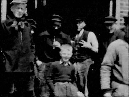 Mannen voor de visafslag, in het midden Andries Scheffer. Harm de Boer schreef, dat links zijn vader Klaas de Boer te zien is, die destijds de afslager was.