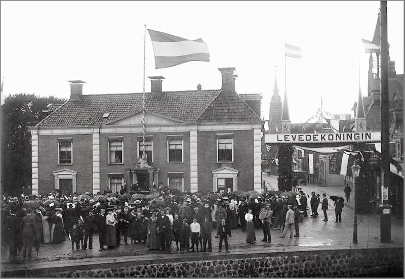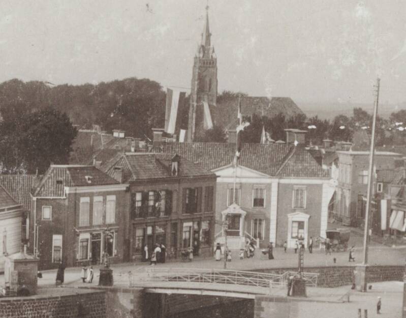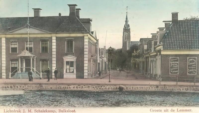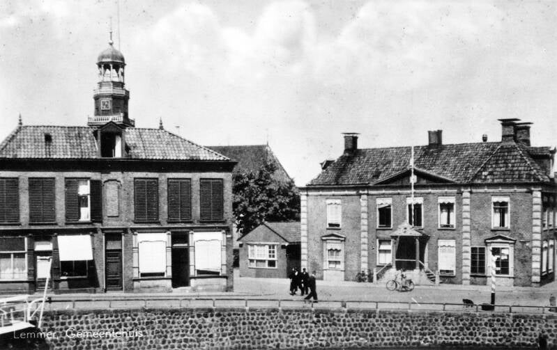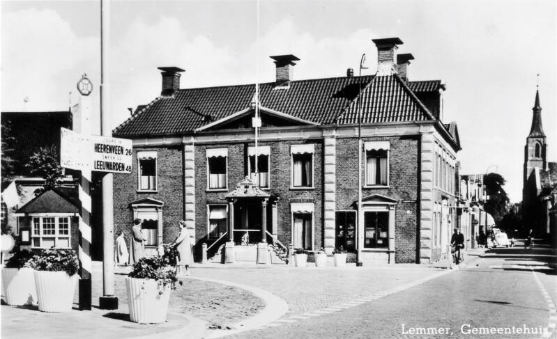 Het centrum van Lemmer rond het jaar 1920, met een prominent zicht op de voorgevel van het gemeentehuis en op de achtergrond de toren van de Hervormde Kerk.