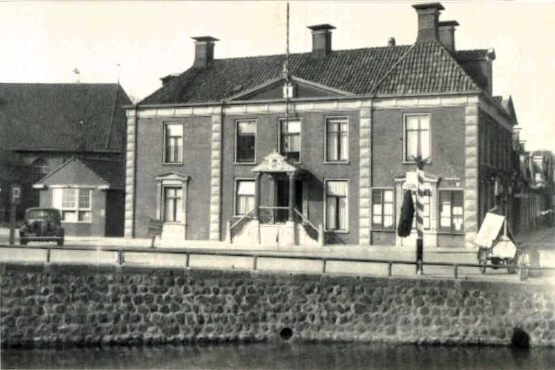 Lemmer 1950: Links van het gemeentehuis bevindt zich het politiebureau. In de rechtergevel is 'De Kou' gevestigd, een ruimte waar onder andere huwelijken werden afgekondigd. Rond deze periode vond ook het huwelijk plaats van Wouter van der Meer en Janny Koehoorn. Rechts op de voorgrond is Evert de Vries te zien bij zijn ijscokar. Op de achtergrond is de toren van de Gereformeerde Kerk zichtbaar, met de huidige spits.