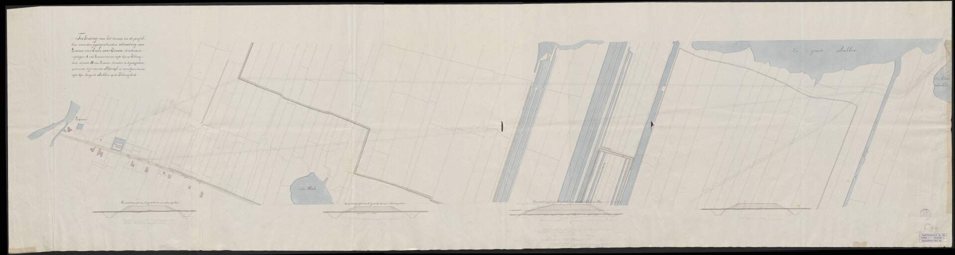 Plattegrond van het terrein en de profielen voor de geprojecteerde Straatweg van Lemmer via Sneek naar Irnsum, 1840.