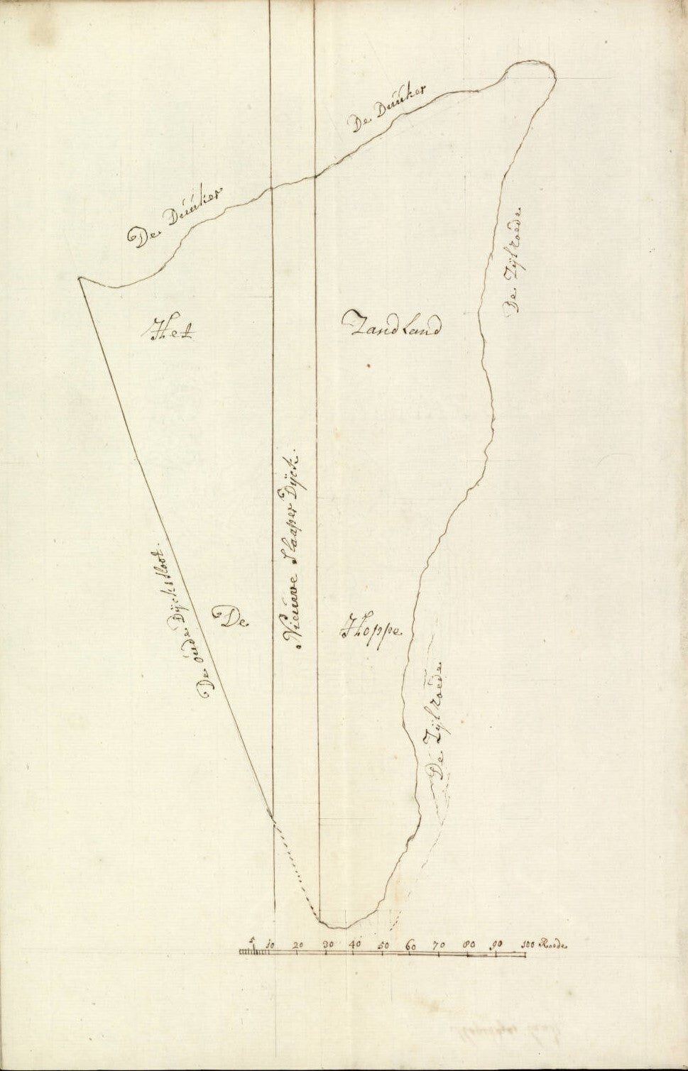 Kaart van de Slaperdijk van Lemmer tot aan de Oude Zeedijk, gelegen ten oosten van Tacozijl. Jaar: 1737.