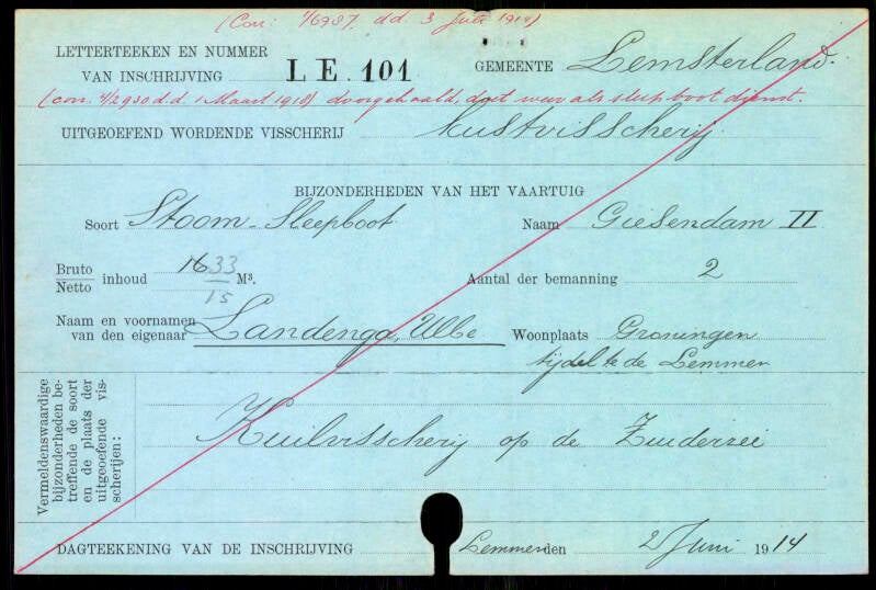 - Opm: Vanaf 1 mrt 1918 weer als sleepboot actief; **woonplaats Groningen, tijdelijk Lemmer;