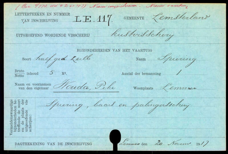 - De Lemster vissersvloot van ± 1915 volgens Jan Wouda: LE 117: Eigenaar: Hennie Thijsseling. Bijnaam: Honk. Woonplaats: Lemmer. Soort: Pluut. Naam Schip: "De Vijf Gebroeders"