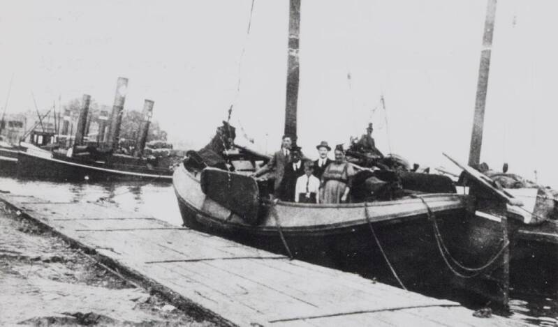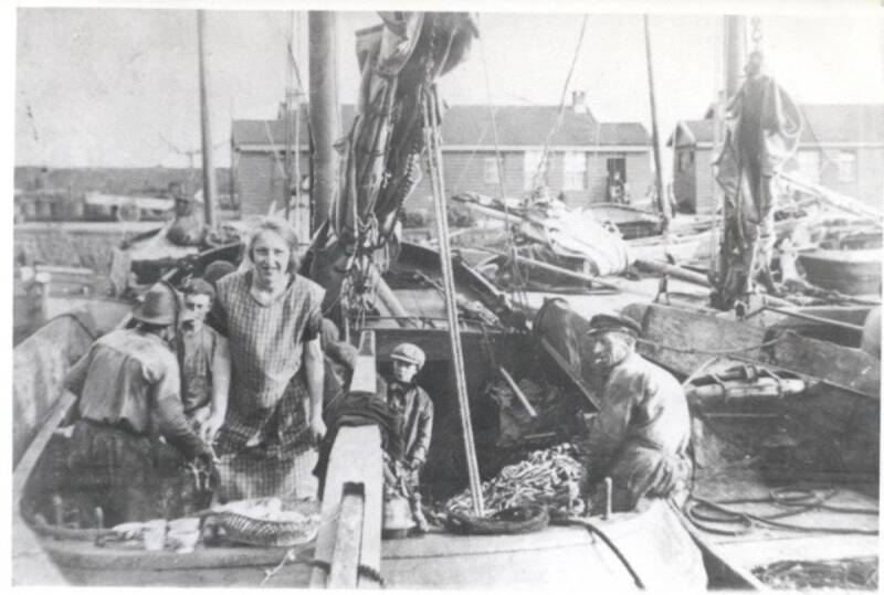 Omschrijving van Evert de Vries: Een opname van de LE 12, 'De Hoop', van Johannes Visser. De aak ligt hier in de oude haven met de noodwoningen op de achtergrond. Hier, vlak voor de hang van De Rook, is men druk aan het pluizen met een vracht ansjovis. Helemaal rechts van de aak zit Johannes Visser, zelf. Aan de andere kant van het roer staat zijn zoon Heiko (met hoed) zijn dochter Hielkje en daartussen zijn zoon Wiep. Hielkje heeft zeker net het eten voor de mannen gebracht, want achterop staat een mandje met brood en een paar kopjes en bekers. Mijn oom Evert was altijd als vaste pluizer bij de LE 12 in actie, later heb ik dat ook wel gedaan. Mijn beloning bestond dan meestal uit wat kleine palinkjes. Ik herinner mij ook dat Heiko, mij bij een gelegenheid eens vijf pond paling mee gaf. "Dan hast ek ris hwat bússinten". Visser had aan de Vissersburen 70 ook nog een viswinkeltje.