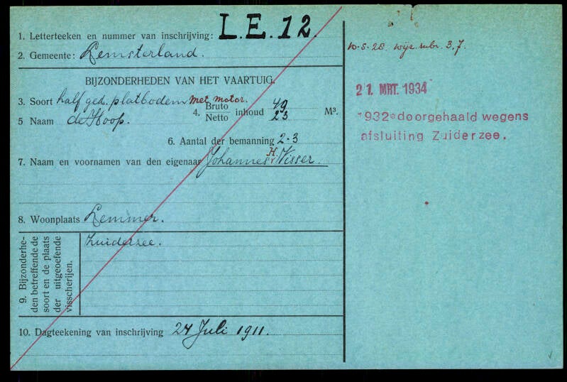 - Verhaal: Zijn vrouw was Rees van Hielk, een zus van Janus Coehoorn zijn vrouw Jansje en van Renze Visser zijn vrouw Anne. Siemen van Hielk Zeldenthuis was hun broer. Oude Hielk had een fruithandel in de Schans, waar later Janus woonde. Aan de ene kant had Jan Pen zijn nettenwinkel (later Libbe Bouma) en aan de andere kant had slager Koning zijn slagerij. Maar op Johannes terug te komen, het was een fijne man en een fel drankbestrijder. Daar had hij veel ellende van gezien. Ze woonden in de Schans, waar later Marten Kokje woonde, ze hadden er ook een winkeltje, daarna hebben ze op het Streekje gewoond bij de R.K. kerk en daarna aan de Vissersburen, waar ze een viswinkeltje hadden. Ze hadden twee zoons, Heiko en Wiebren en twee dochters Rommie en Hielkje. Janus had altijd een een manchester vest over zijn trui droeg. Rees zijn vrouw is niet zo oud geworden. Deze 45 voet aak voor Johannes Visser, werd wat breder gebouwd dan de meeste Lemster aken, terwijl de kop aan die van een boeier herinnert. Het schip voer een groen schild waarop de naam De Hoop. De LE 12 had de reputatie een snelle zeiler te zijn, die veel wind en zee kon doorstaan. Daarom zou zij ook gebruikt zijn als jager voor het thuisbrengen van de vangst, en soms als sleepschip voor een tweede vaartuig hebben gediend. In het najaar 1940 namen de Duitsers het schip tijdelijk In beslag, terwijl in 1945 Duitsers met het schip naar Enkhuizen vluchtten nadat een kanon op het voordek was geplaatst. In datzelfde jaar nog werd bij de eerste hardzeilerij voor de Lemmer 'de prijs' gewonnen, een 'zilveren' krans van eikenbladen, nu nog in bezit van de dochter van de eerste eigenaar. In 1955 is het schip tot jacht verbouwd, waarschijnlijk op een kleine werf in de buurt van Enkhuizen. Het schip kreeg de naam Rosshouck en was achtereenvolgens eigendom van Gorter uit Enkhuizen, T. Koopman te Wassenaar en sinds 1968 van Ir. W. Croon te Rotterdam (59 VA)