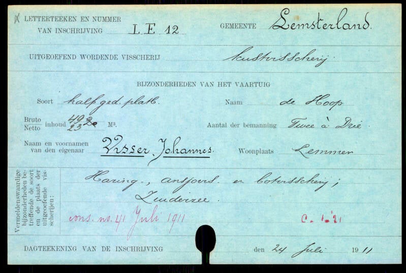 - De Lemster vissersvloot van ± 1915 volgens Jan Wouda: LE 12: Eigenaar: Johannes. H. Visser. Bijnaam: De Happet en Johannes van Hansje. Woonplaats: Lemmer. Soort: Aak vt 45. Naam Schip: "De Hoop" Bouwjaar: 1902 Werf: Gebr. de Boer.