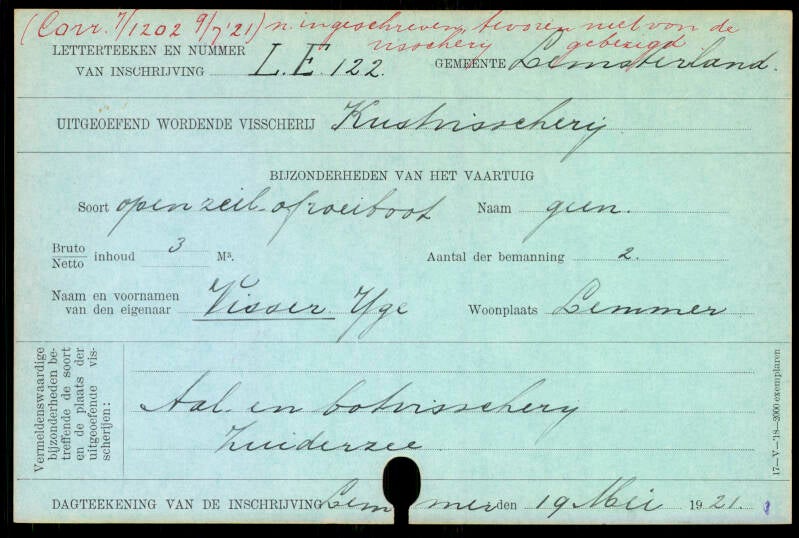 - De Lemster vissersvloot van ± 1915 volgens Jan Wouda: Eigenaar: J. A. Visser. (Later LE 58) Woonplaats: Lemmer.