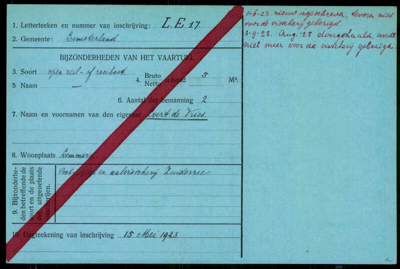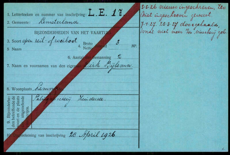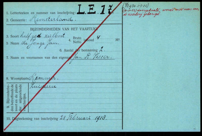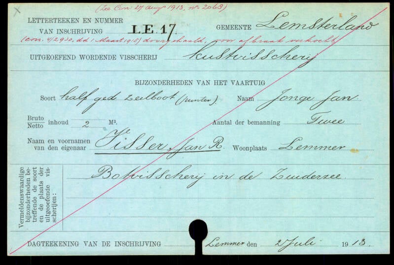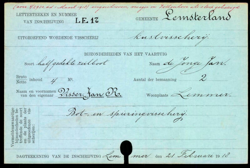 - Uit het archief van 'De Mastmaakster Wed. de Vries': De kleinste vaartuigen die met een mast zijn uitgerust, zijn vletten (vergelijkbaar met roeibootjes) en sloepen. Deze worden ingezet als bijboten of kleine vissersvaartuigen. Jan R. Visser beoefent vanaf 1913 de botvisserij vanuit de halfgedekte punter Jonge Jan (LE 17), die eerder in Vollenhove als sloep dienstdeed. In 1922 wordt dit vaartuig door hem verkocht.