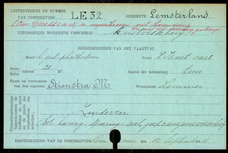 - De Lemster vissersvloot van ± 1915 volgens Jan Wouda: LE 32: Eigenaar: Miente Stienstra. Woonplaats: Lemmer. Soort: houten aakje. Naam Schip: "t Is net oars"