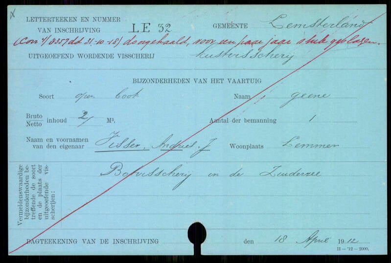 - Opm: 31-10-1918 doorgehaald, voor een paar jaar stuk geslagen; 1918-1922: 't Is net oars' gedekte platbodem, M. Stienstra, Heerenveen