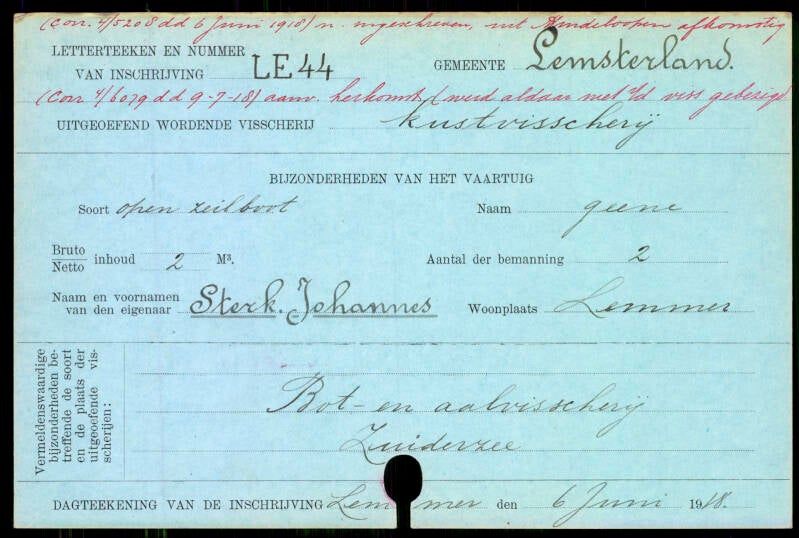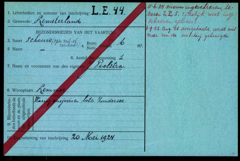 - Opm: {1906: hout met zijzwaarden, en open bun, Oudheidkamer, Lemmer, mp a}; 1918-1922: open zeilboot (uit Hindelopen afkomstig) van {fa.} Joh. Sterk; {1921-1927: schouw van Poppe Bootsma, archief wed. S.J. de Vries, Deb.boek, 206, 57}
