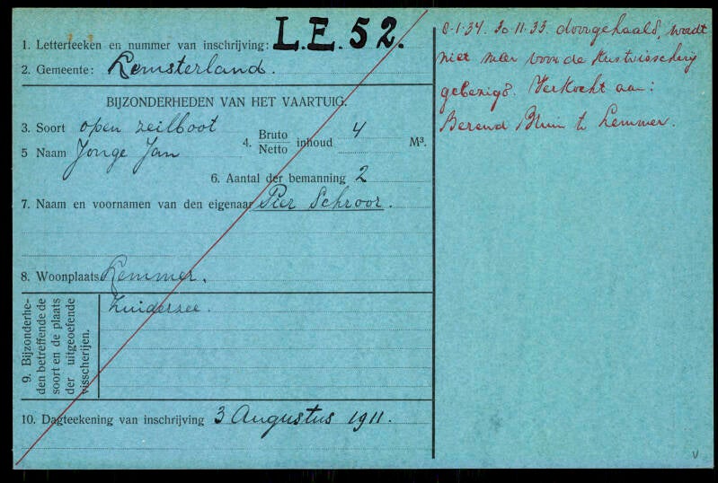 - De Lemster vissersvloot van ± 1915 volgens Jan Wouda: LE 52: Eigenaar: Pier Schroor. Soort: Open, houten aakje. Naam Schip: "De Jonge Jan" eerder was deze van Lub Visser en Lou Spiering.
