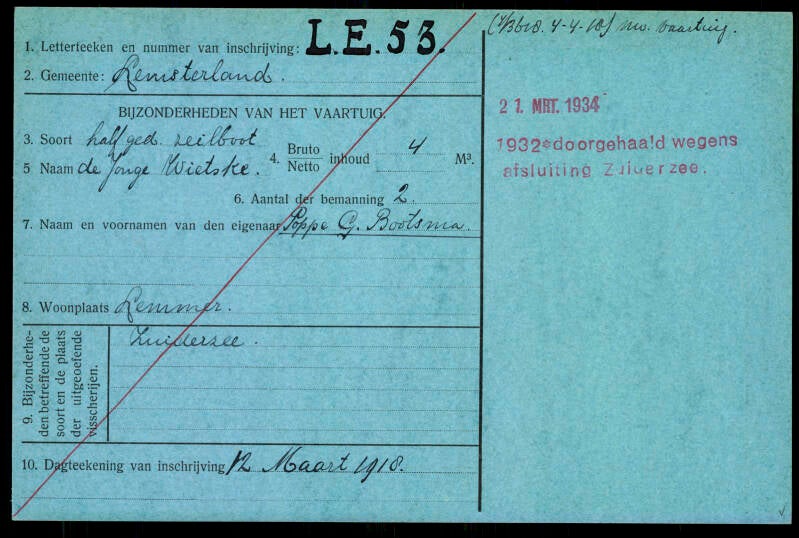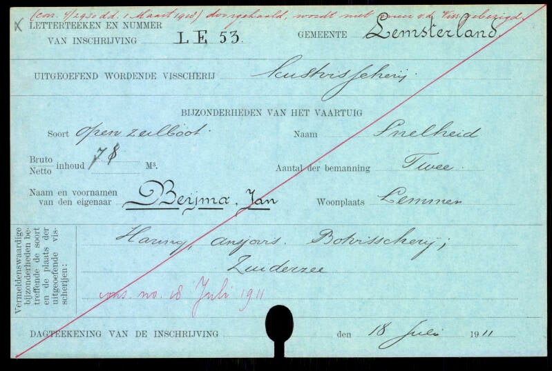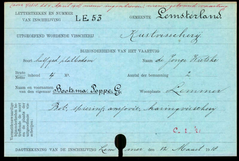 - De Lemster vissersvloot van ± 1915 volgens Jan Wouda: LE 53: Eigenaar: Jan Beijma. Woonplaats: Lemmer. Soort: Houten aak. Naam Schip: "De Snelheid" - LE 53: (Eerder 181) Eigenaar: Poppe. G. Bootsma. Bijnaam: De Skieter. Woonplaats: Lemmer. Soort: Aak vt 40. Naam Schip: "De Jonge Wietze" Bouwjaar: 1902. Werf: Gebr. de Boer.