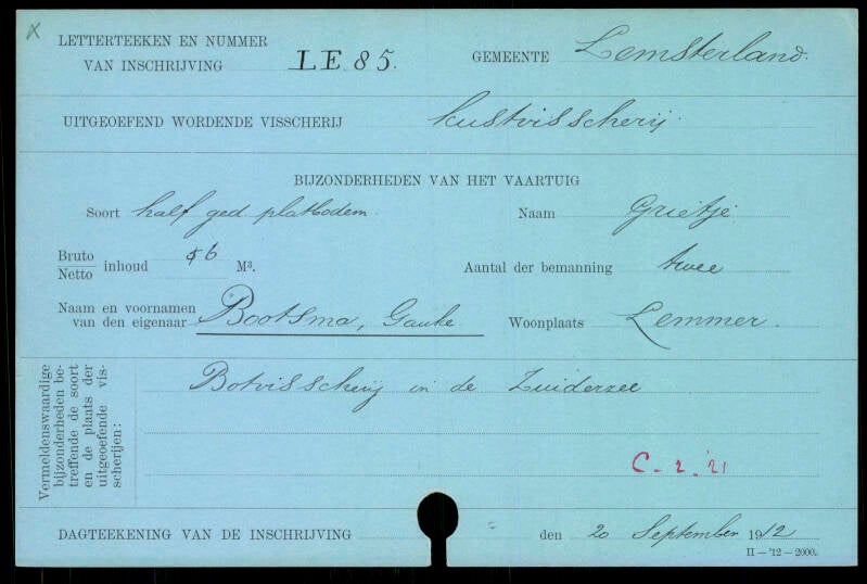 - De Lemster vissersvloot van ± 1915 volgens Jan Wouda: LE 85: (Eerder LE 182) Eigenaar: Gauke Bootsma. Bijnaam: De Skég. Woonplaats: Lemmer. Soort: Schouw. Naam Schip: "Grietje (zijn vrouw), en de twee gebroeders"