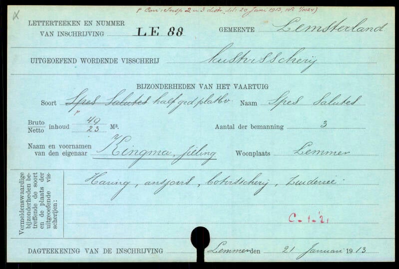 - Aanvulling: 1913 - LE 88 - Zwerver-Gebr. de Boer. De Spes Salutis, oorspronkelijk gebouwd voor de heer Jilling Kingma, was een uitzonderlijk snelle zeiler die tijdens de wedstrijden van de 'Koninklijke' voor Amsterdam meerdere prestigieuze prijzen wist te behalen. Het schip, met registratie LE 88, werd veelvuldig ingezet voor het hoekwantvissen, een veeleisende activiteit waarbij de bemanning binnen een half uur maar liefst 225 haken moest voorzien van een gekookte garnaal. Op een later moment werd de Spes Salutis verkocht aan de heer Eibert Visser en voer toen onder het registratienummer LE 1. Een daaropvolgende eigenaar, de heer Polderman, liet het schip ombouwen tot een jacht. Tegenwoordig is het vaartuig eigendom van de heer L. Sliggers te IJmuiden en staat het bekend onder de naam 'Zwerver' (71 VA).
