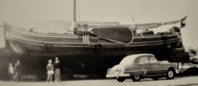 Joure, 1912. De tewaterlating van de boeier ‘Almeri’, een schip van ruim 18 meter lengte met de lijnen van een inspectieboier (zie hfst.6) Hoewel Auke van der Zee in 1901 de werf overnam en overschakelde op ijzerbouw, betekende dat niet, dat hij geen houten schepen meer bouwde. Onder: de Almeri in later jaren. (Foto’s: FSM)
