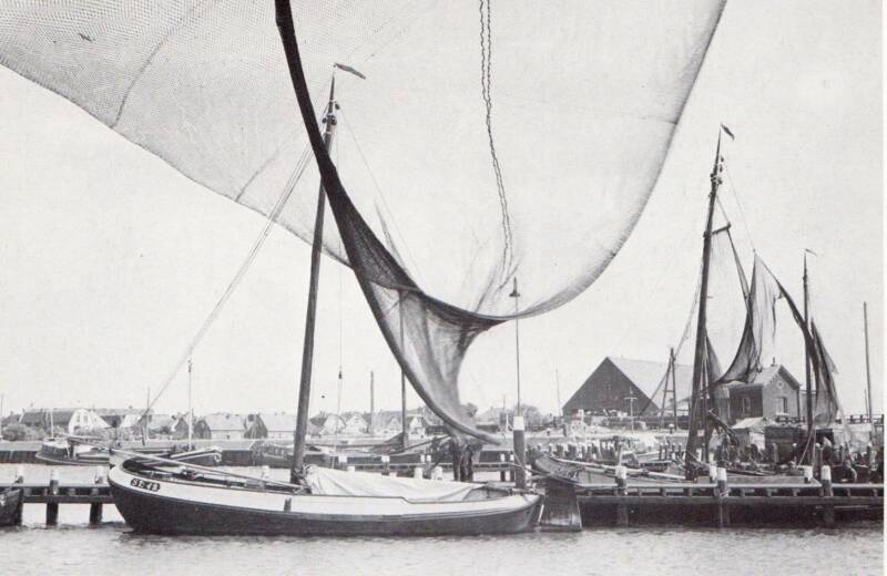 Stavoren, jaren vijftig. De ST 49 van Gerrit Mulder aan de nieuwe steiger. De ST 1 (ex-LE 6) van Jelle Zwaan aan de andere kant.