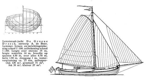 Inrichtingsplan en dekplan van De Groene Draeck. De gestrekte lijn maakt direct duidelijk dat deze aak afstamt van de boeieraken en niet van de Lemster visaken. Vergelijk ook deze gestrekte lijnen met die van de boeier Almeri van Auke van der Zee.