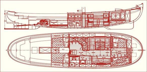 Inrichtingsplan van een moderne Chris Beuker aak (ontwerp Martijn van Schaik): de Iduna (GR 4) uit 2009. Goed te zien is de geveegde lijn van het onderwaterschip, waarbij het diepste punt onder de mast ligt, die relatief ver naar achteren staat. De vingerlingen voor het roer zijn verticaal geplaatst, wat het roer effectief maakt en door de iets scheve stand van de achtersteven leidt tot een balansroer, waarbij een deel van het roer voor de roeras draait, wat de effectiviteit van het roerblad zeer bevordert.