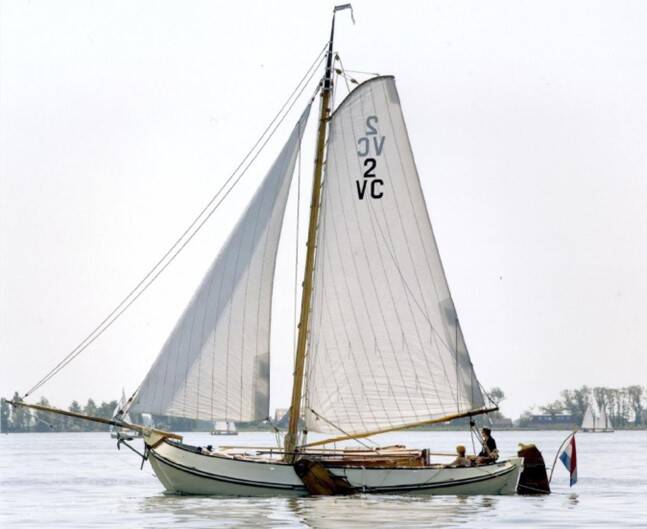 Fluessen, 2010. De Orion onder zeil bij zwakke wind. Opvallend zijn de schuine stand van de mast, die het scheepje vanaf oplevering in 1907 heeft gekenmerkt, en de lange kluiverboom. (Foto: Ton Hartog) Onder: 1938.
