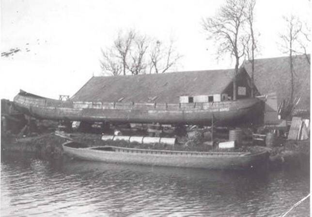 Drachten, scheepswerf Van der Werff op het Buitenstvallaat: De (ver)bouw en de tewaterlating van een skûtsje langs de oever van de Drait.