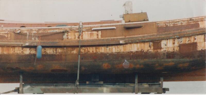 Lemmer, ca. 1990. De Rommerswael voor de restauratie op de kant bij mastenmaker Van der Neut. (Foto: P. Sterk) In de periode 1980 – 1984 woonde er een junk op het schip en ontstond er brand in 1984. Peter Sterk betaalde in 1992 voor het ernstig aangetaste casco f. 120.000.-, wat zeker geen ‘vriendenprijs’ genoemd kan worden. Voor dat geld kon je in die tijd ook een nieuw casco laten bouwen van een iets kleinere aak.