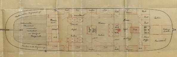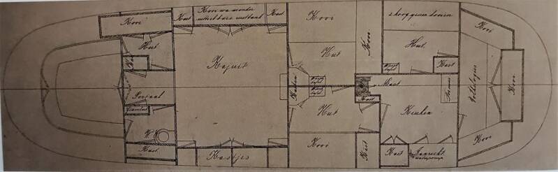 Het inrichtingsplan behorende bij het zeiljacht op bovenstaande tekening is 19e eeuws met voor de mast het verblijf van de schipper met zijn knecht. Achter de mast een herensalon en meer naar de kuip een damesverblijf. (Tekening beschikbaar gesteld door het Fries Scheepvaart Museum). Van de Rommerswael (toen Elisabeth) is een inrichting uit 1902 bekend, die moderner, zeg maar 20e eeuws van karakter is, zonder gescheiden dames- en herensalon.