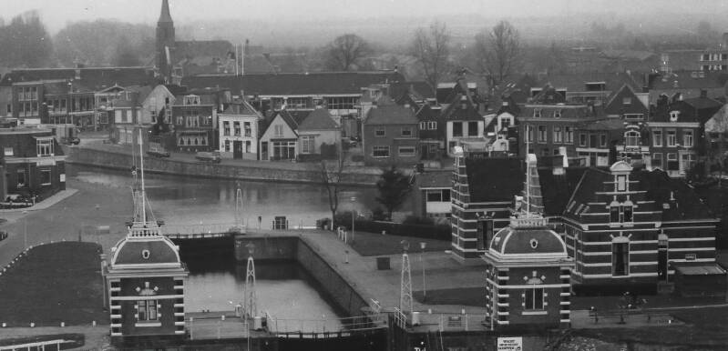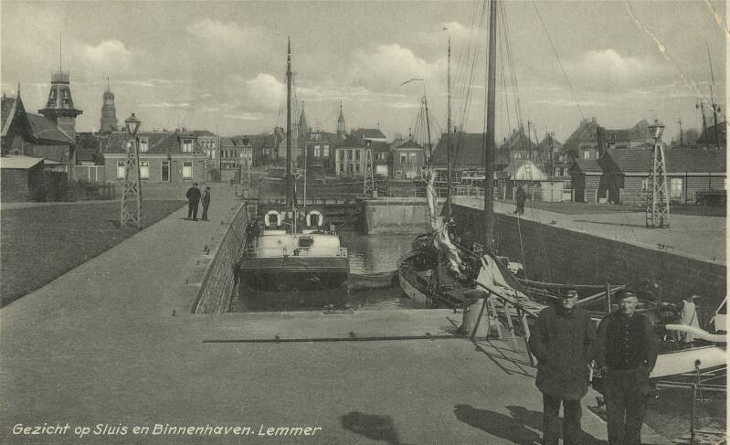 Gezicht op de Lemstersluis en binnenhaven. Voorop de foto links, is Koert de Vries, daarnaast Evert de Vries (ooms van Evert de Vries van de bakkerij), op de achtergrond zien we links Jan Scheffer, met naast hem de schipper van de motor. Zij hebben de motor en het schip vastgezet, dat leverde meestal elk een kwartje op. Om dan deze 50 cent te verdelen werd afgeteld, een van de mannen draaide zich om en noemde een getal, bijvoorbeeld 11 er werd dan afgeteld wie dan nummer 11 en 12 troffen kregen elk 17 cent voor nummer dertien was 16 cent over.
